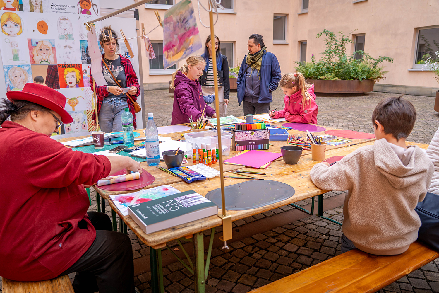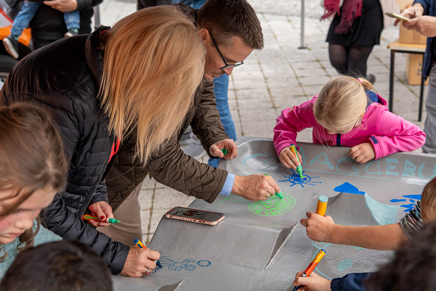 Auf dem Alten Markt gab es für große und kleine Gäste ein vielseitiges Spieleangebot. Neben dem Kinderspielmobil war auch die Fahrbibliothek vor Ort. Kreativ ging es beim Malwettbewerb der Jugendkunstschule zu. Dazu gab es Fahrübungen mit Fingerboards und einem Pumptrack-Modell.